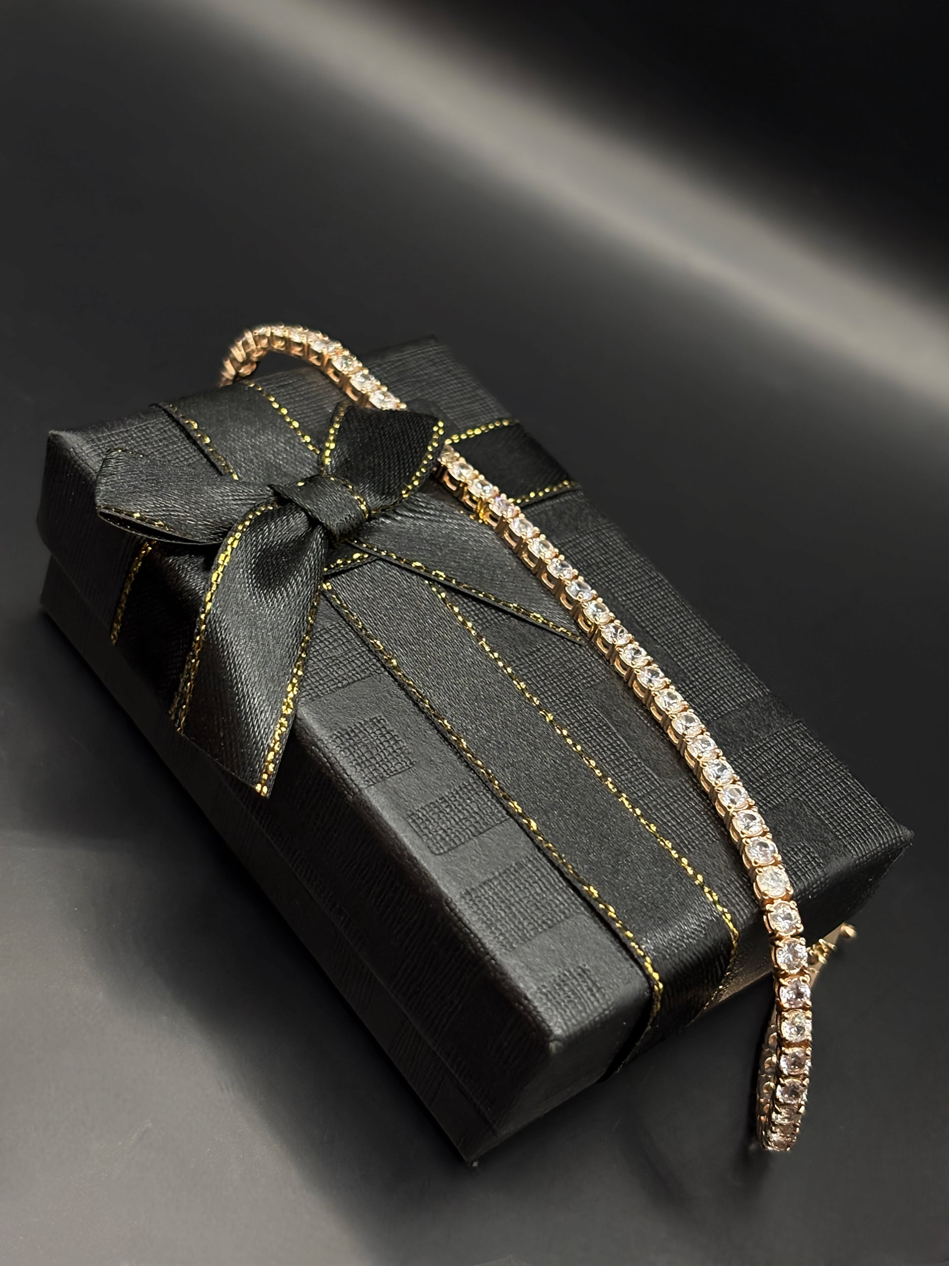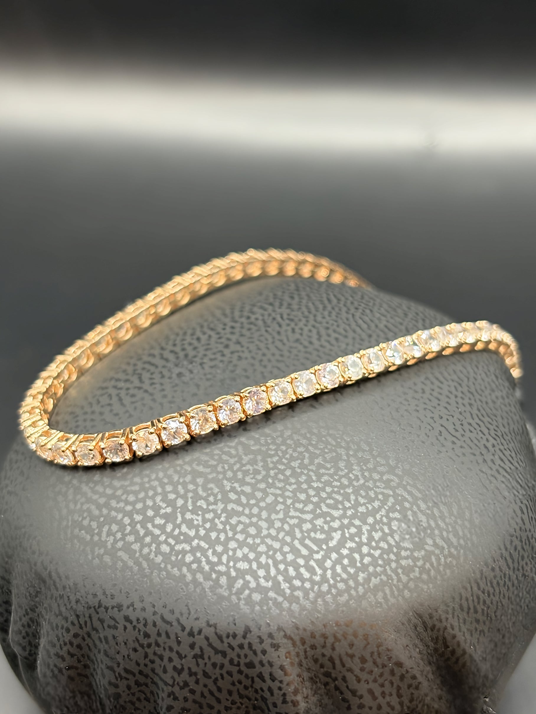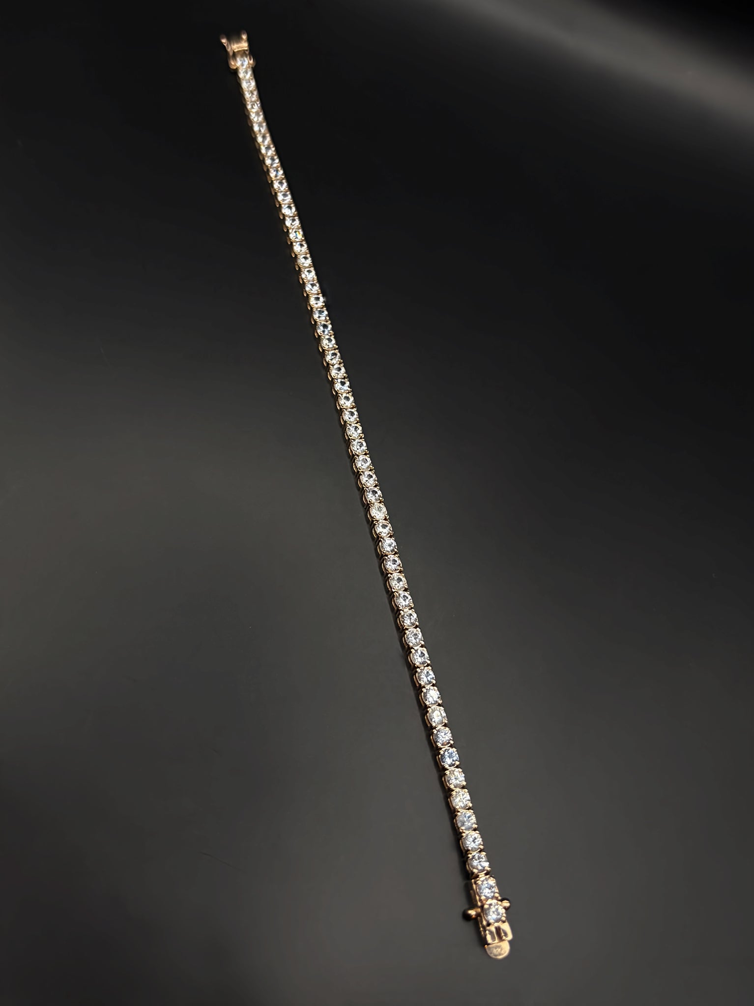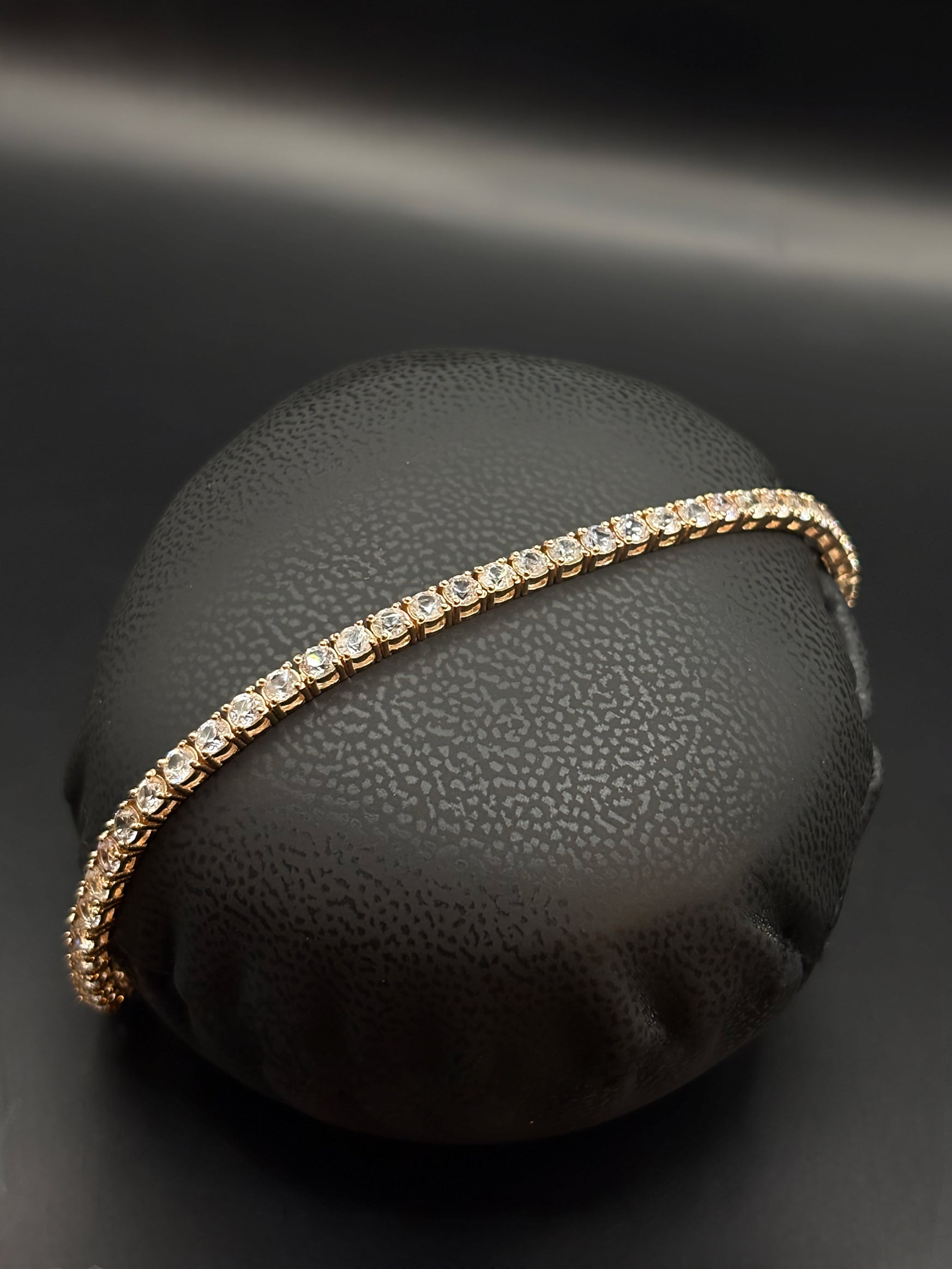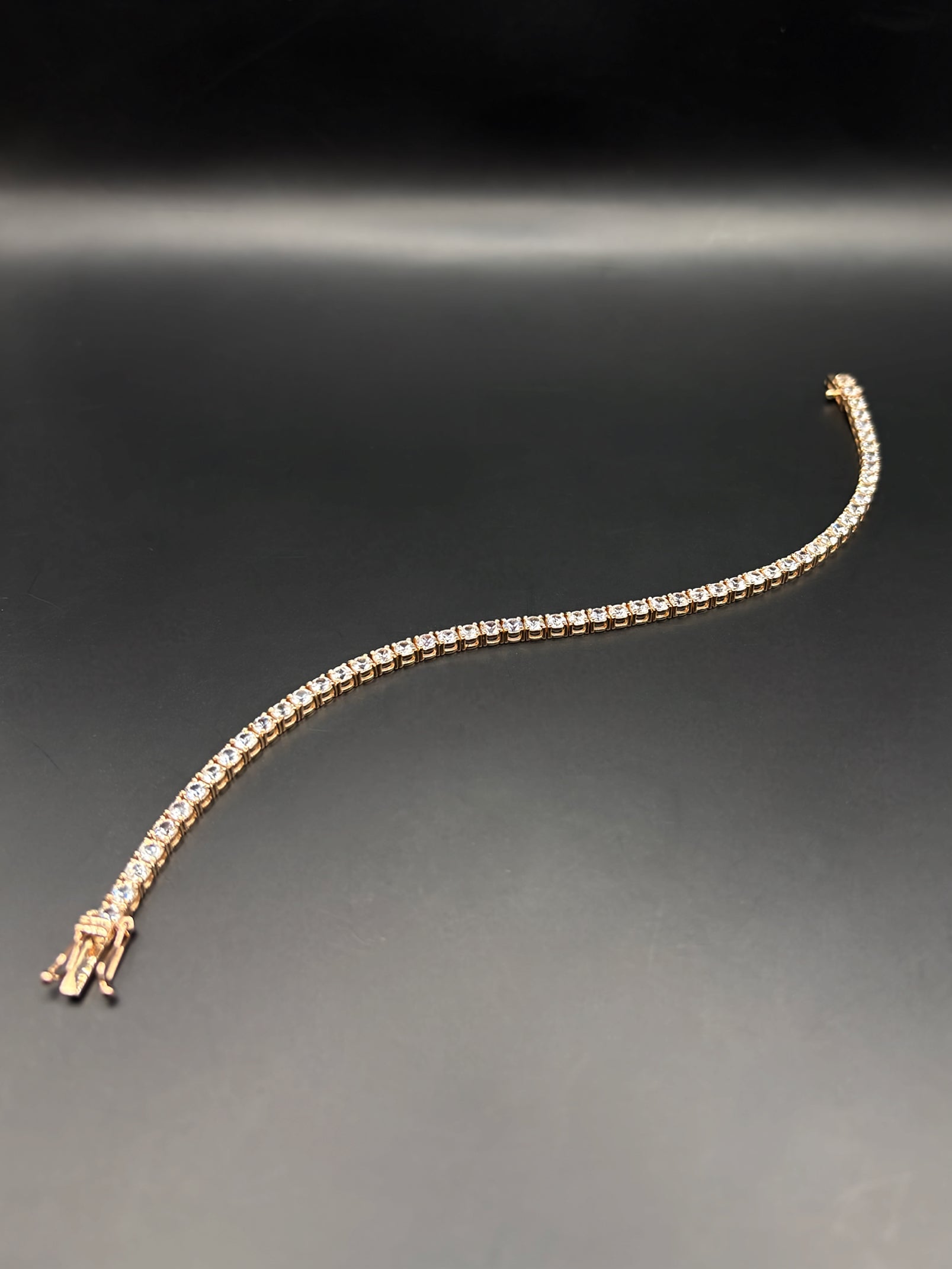 The soft blush of rose gold meets the brilliant sparkle of white sapphires, creating a striking contrast that radiates elegance and warmth. Handcrafted to perfection, this tennis bracelet showcases round white sapphires, each 2.75 mm stone expertly set to form an unbroken ribbon of light. Lightweight yet substantial, it offers exceptional comfort for daily wear while maintaining the sophistication of a true heirloom piece. Whether worn alone for subtle glamour or layered for a modern look, this bracelet embodies timeless beauty and refined style.