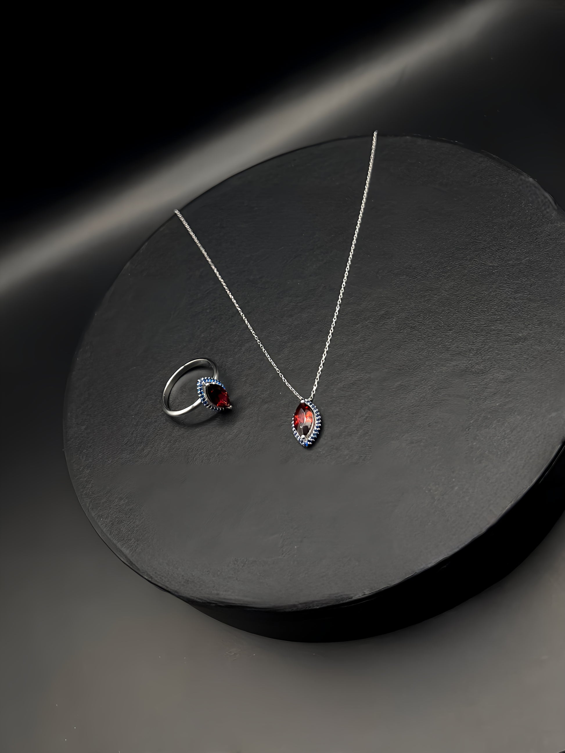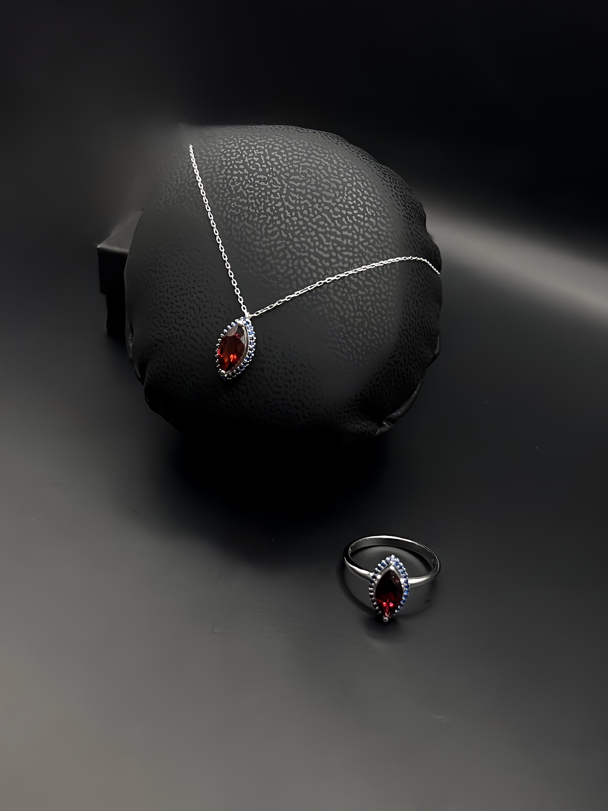 Embrace elegance with this stunning set featuring a pendant and ring, both crafted from luxurious white gold. At the heart of each piece is a vibrant marquise-cut red garnet, radiating deep, rich tones. Surrounding the garnets are sparkling blue sapphires, creating a captivating contrast that highlights the brilliance of the central stones. This set is a perfect blend of bold color and timeless design, making it an exquisite choice for any occasion.