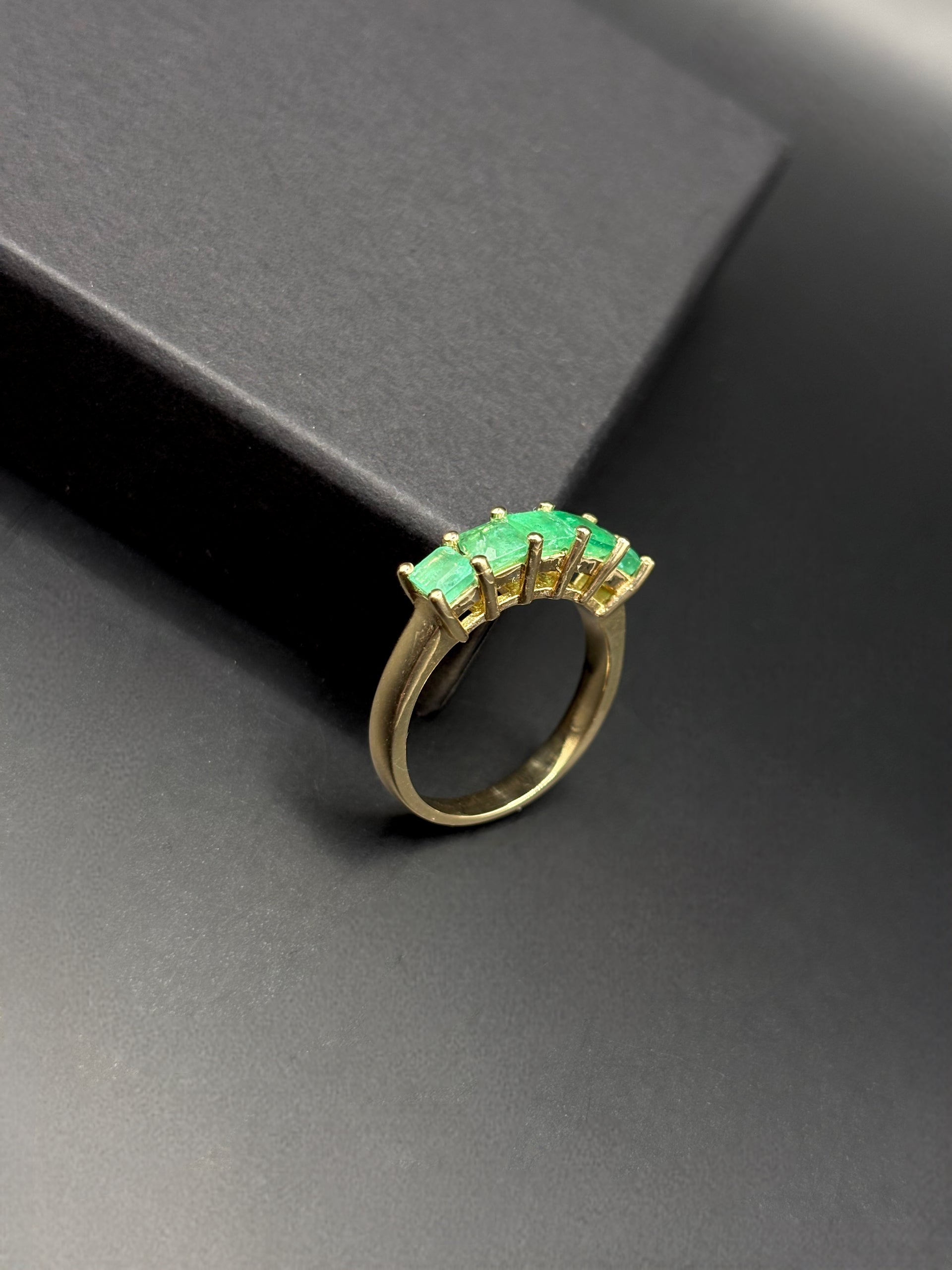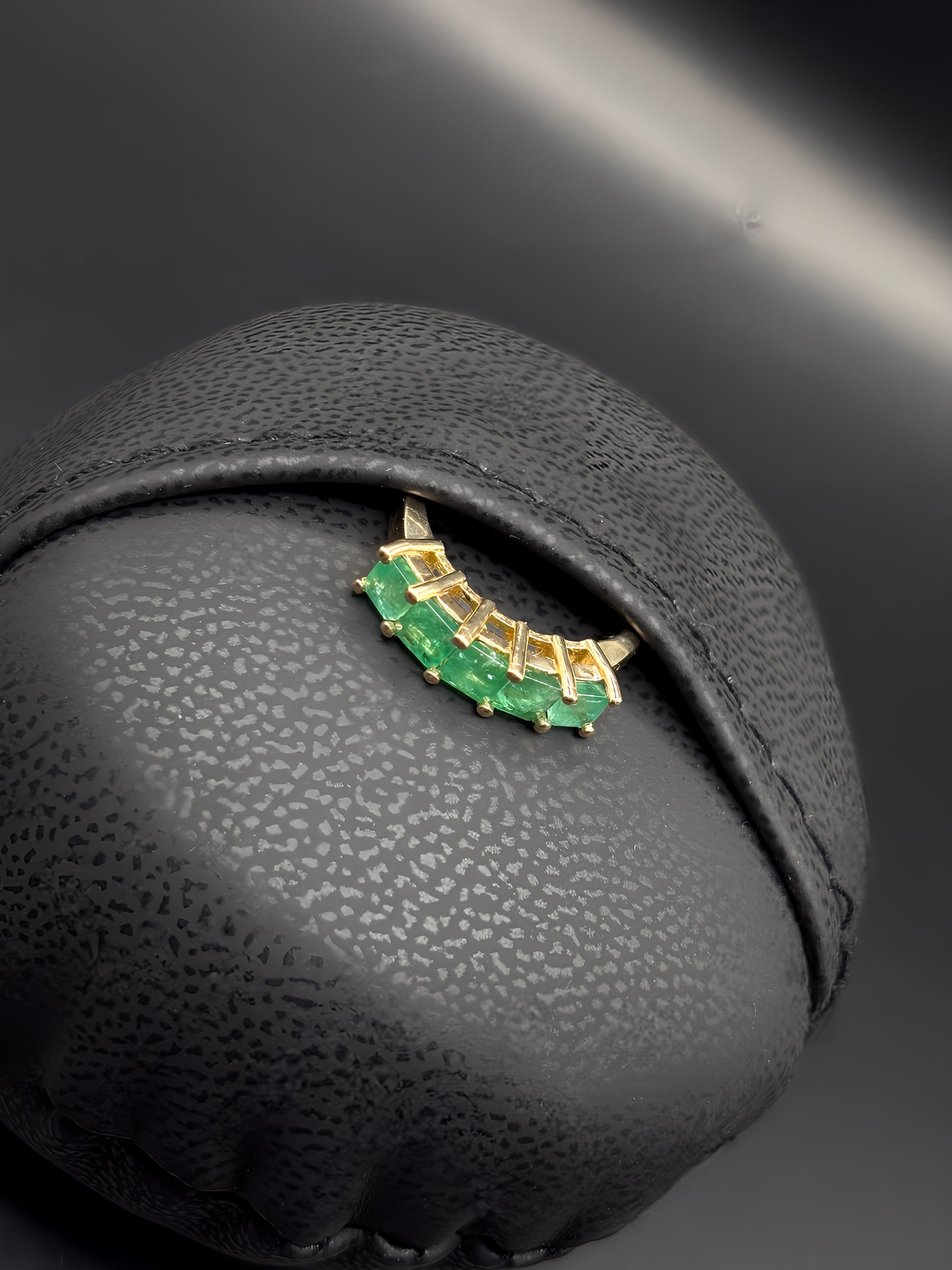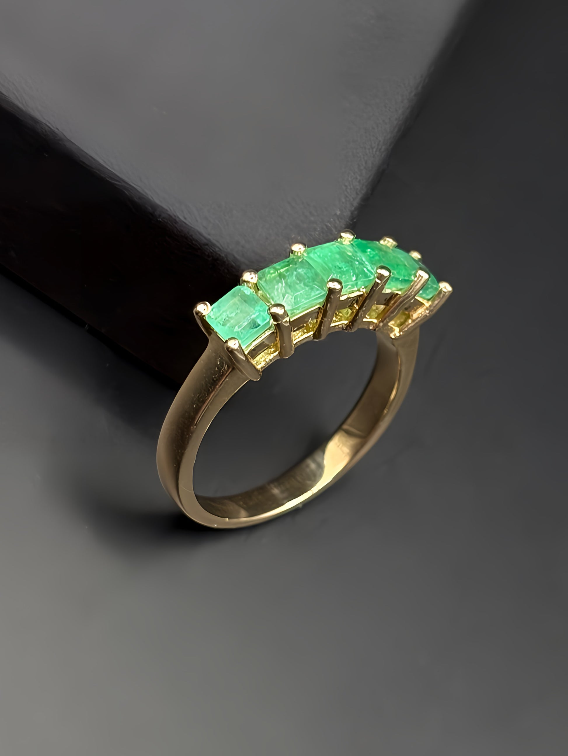 Experience timeless sophistication with this stunning yellow gold ring, featuring five meticulously set square-cut emeralds. The vibrant green gemstones, paired with the warm glow of yellow gold, create a design that exudes luxury and refinement. Perfect for marking special moments or adding a touch of elegance to your everyday style, this ring is a true masterpiece of craftsmanship and beauty.
